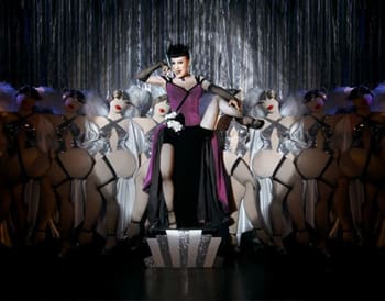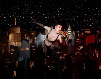 It’s the puppetry that’s a little harder to describe, and it’s what raises the evening from merely campy fun to campy fun as high art. Basil Twist had already started pushing the boundaries with his Symphonie Fantastique at the very same space at HERE Arts Center in the late 1990s, an abstract puppet show that was done entirely in a tank of water. This is comparatively more traditional puppetry, including human figures being manipulated with strings from above. But by no means is it confined to the string variety. To officially be deemed puppetry, it merely requires that something inanimate be brought to life by human agency. This encompasses everything from a spotlight at the beginning of the show – seriously, how often are you delighted by a spotlight? – to, sometimes, the entire set of a particular section, as in a number celebrating New York wherein the skyline becomes a moving character. And everything in-between. And then some. And then some more.