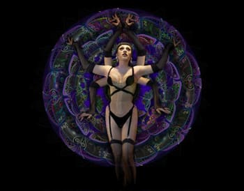 Okay, I’ll give you some hints. If you’ve ever seen a drag queen perform on stage, you’re probably not too far off the mark in that respect. Joey Arias wears a costume of a woman’s body wearing a sort of black bikini with just a hint of dominatrix. But he doesn’t lip-synch; with a few exceptions for technical reasons, you’re hearing him sing live right in front of you. And although once in a while he’ll go for a note that he doesn’t quite hit, he nonetheless has a rather amazing voice, able to take on many styles and nuances (from Led Zeppelin to torch songs) as well as an occasional freaky pitch several octaves high, just before it would enter “Only Dogs Can Hear This” territory. And make no mistake, the humor is as campy as Charles Pierce, Charles Busch, Charles Ludlam or even any of the non-Charles DQs.