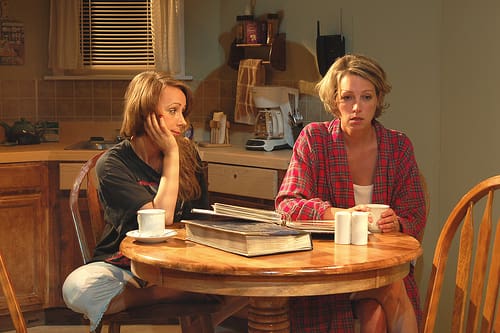 If Parasite Drag were a product of Playwriting 101, its author, Mark Roberts, would be the brightest kid in the class. He has an ear for dialogue, a sure way of shaping a scene, and beautifully subtle insights into women, a rare enough gift these days, especially in a male playwright.  And he is lucky enough to have two extraordinarily fine actors – Mim Drew and Agatha Nowicki – who raise the first scene of the second act to the level of art. Unfortunately, it is the men – two brothers, one a pastor, the other a roustabout, reunited by the imminent death of their sister – who are at the center of his play, and the actors playing these roles are not quite in the same league. And, as hard as  director David Fofi tries to keep sustained excitement throughout the evening, Roberts jams too much into the play – incest, drug addiction, suicide, cunnilingus – and rather than explore each subject that arises, he is content to shock us with each new revelation.