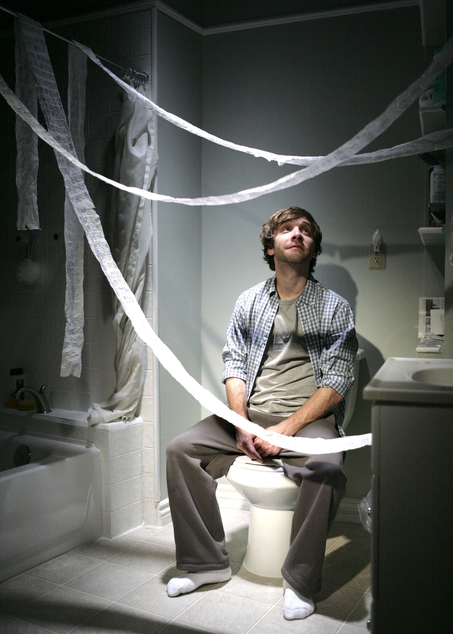 It is the story of David (Chris Klopatek), a 25 year-old obsessive/compulsive who has locked himself in the bathroom of his mother’s home in Michigan. At the time he locked himself in, David was seeking a Masters Degree in Philosophy. So, with no computer, he scribbles his thesis on toilet paper. When David’s co-dependent mother Pam (Marina Coffee) is injured in a fall, neighbor Julie (Liz Holt) takes a job helping around the house so she can buy a car and get out of Michigan. Not surprisingly, Julie develops feelings for David – in declaring her need to move on in life, she entices him to re-think his self-imposed internment, which is already going on one year.