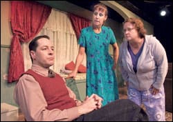 Whether these are very brave actors or they’re just as happy as pigs in shit doesn’t matter; the bottom line is that all three actors remain truthful as they run wild with their outlandish characters and outrageous dialogue. Ms. Metcalf has the chops to be a silent film star – her variety of facial expressions is so extraordinary that one would wonder if her flesh was made of silly putty. I’m rather certain that if you look up the word “droll” in the dictionary, you would see Mr. Stewart’s mug; he is a clown of the highest order. Although Ms. Flanagan’s role encompasses far less stage time, she truly has the most amazing moment of the night with just the bare necessities.