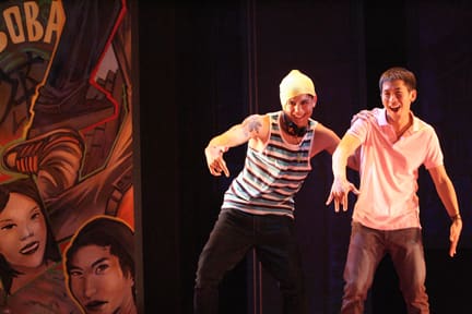 Two men dancing on stage with lively expressions and colorful background.Jean Lee (Joan Almedilla) has escaped the clutches of her tyrannical mother in Connecticut by moving into the seedy Chinatown of Brooklyn’s Sunset Park with her son, Norman (Lawrence Kao). After bumping into the B-Boy bigwig Three-Point (Leng Phe), the neighborhood neophyte Norman inadvertently challenges this supreme ruler of beat dancing to “battle.†This gives Norman one month to become the Break Boy to beat – if he does, then his first love and slam poet Sweet Cindy Chang (Liza B. Domingo) will attend Homecoming with him. Norman is aided by his new pal Wingnut (Matt Tayao) and the building Superintendent Sir Master Cert (Blas Lorenzo), who was once a B-Boy himself and still knows the moves. Before you can say, “Wait a minute, this sounds familiar,†Cert refers to Norman as the Karate Kid.