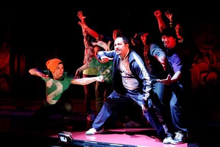 Performers energetically dancing on stage with vibrant lighting.No doubt critics will be forgiving of the shortcomings in Krunk Fu Battle Battle, the world premiere Hip Hop musical directed by Tim Dang for East West Players. You see, Krunk is so crammed with contagiously fun urban dancing – and it has such an exuberant cast – that one may forgive it for being a cushy mess, although not a lamentable mess’¦meaning that there is an idea for a new musical here that invites further exploration, but the originators need to return to the drawing board with an auteur in tow.
