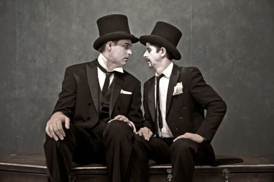 It is therefore most apt that the latest show from Ten West (the silent comedy duo of Stephen Simon and Jon Monastero under the direction of Bryan Coffee) is titled Ineffable, meaning that which is too extreme to be put into words. They begin on a coffin; both actors wear black, funereal tuxedo tails, and their faces are powdery-white with black accents on their nails and around their eyes. Simon, the taller of the two, is a hooded Death; he uses his scythe as a rowing implement and the coffin for a vessel, resembling a River Styx Boatman. Monastero is the Chaplinesque Everyman who coyly tries to distract Death from his errand at hand – he mugs, points and splashes the imaginary water around the boat. The scene is breathtakingly hilarious and infinitely theatrical, celebrating Grand Guignol, vaudeville, silent movies, and commedia of the highest order.