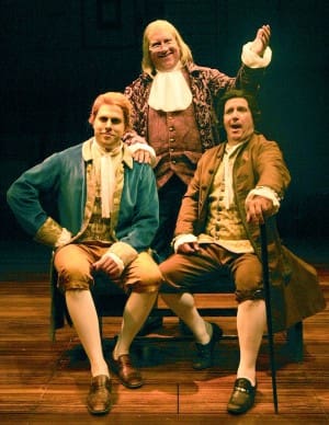 Strength. Courage. Character. Fortitude. These are traits that have inspired Americans, both in our leaders and in folklore. The 1968 musical 1776, now receiving a splendid production at Glendale Centre Theatre, is chock-full of the spirit that audiences need to experience in uncertain economic and political times. Based on the Second Continental Congress’s debate over the ratification of the Declaration of Independence, 1776 is wisely more folklore than truth: for example, Peter Stone’s intelligent and very funny book includes a collection of bon mots from Benjamin Franklin’s entire career which are conveniently inserted into the action – as are the many letters between John and Abigail Adams. The truth is that both the debates and signing of the Declaration were a slipshod affair (historians can only surmise the date of the signing, but it surely was not July 4) and too much fidelity to the truth – especially the timeline of events – would have made for poor storytelling.