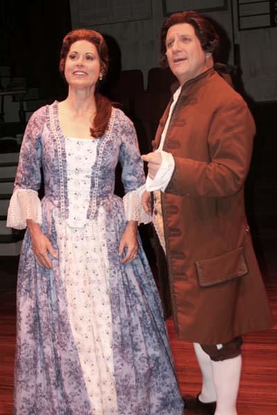 This is the first time that so many powerful performances have graced this Equity Guest Contract venue at once: As John Adams, Peter Husmann avoids the trap of acting like one so many find “obnoxious and disliked” – he is merely a man devoted to a cause, and he completely evokes our sympathy when he sings to the heavens, “Is anybody there? Does anybody care?” (take heed, modern bookwriters – even with 25 characters, 1776 has a central character:something that is sorely missing from most modern librettos).