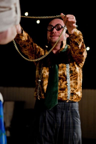 This satire features an astoundingly talented company. The Dromios’ clowning showcases a mastery of the Bard’s linguistic puns, heightened by a spectacular array of physical comedy. On opening night, Antipholus of Syracuse (Schroeder) responded to lighting flukes throughout the show with hilarious, self-consciously theatrical winks to the audience. The ensemble is also packed with remarkable character actors.