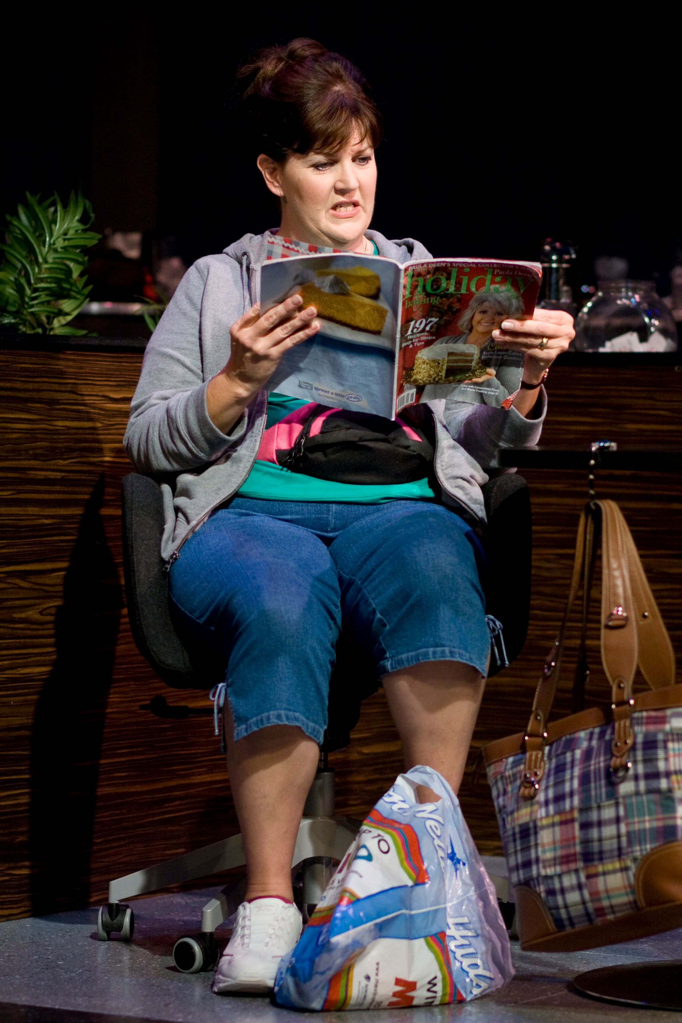 From the moment Gilb bursts onto the smartly laid-out set with overflowing carry-on bags and a giant pink fanny pack as she gabs loudly on her Bluetooth device, she grabs our attention and refuses to let it go. Intermittently bubbly and awkward, Patty keeps us laughing through such self-conscious lines as, “That’s okay. This is what I do. I annoy people.” But as the play develops, she reveals an underlying pathos that breaks through the bubbly façade.