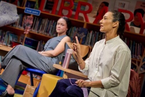 Leading the discussion is Don (Irwin), the head of school who masterfully navigates the school’s core principle: “Everyone should feel seen by the community.” Irwin’s careful delivery and pauses, brimming with guarded anticipation, are delightful. Anti-vaxxer Suzanne (Hecht), the longest serving on the executive committee, is a white, wealthy, and deceptively soft-spoken (OK, passive-aggressive) parent volunteer and committee member who gets some of the sharpest comebacks, including gems like, “There’s no benefit in Feeling Seen if you’re simultaneously being Othered.”