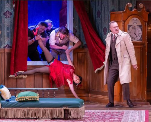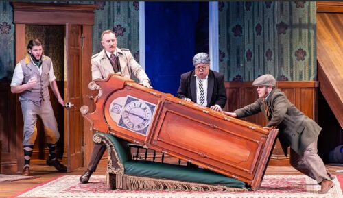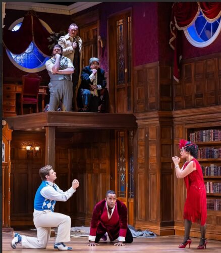 The play-within-a-play structure allows the talented ensemble to shine in dual roles as both Cornley’s ill-fated drama society members and their over-the-top murder mystery characters. Regina Fernandez is Sandra (as Florence Colleymoore), a diva determined to survive the show’s crumbling set—and her own theatrical ambitions; Mary Faber is stagehand Annie who steps in as Florence when the knockout Sandra gets knocked out; Garrett Clayton chews scenery (whether it’s fallen or not) as Max, playing Cecil Haversham and Arthur the Gardener; and Reggie DeLeon‘s ever-bumbling Dennis–who plays the Butler, Perkins–is a standout as he tries to keep the action moving along.