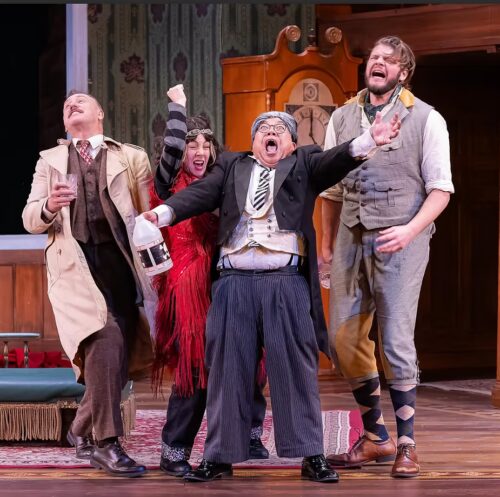 Czerton Lim’s ingenious scenic design functions as a character in its own right, delivering controlled chaos at every turn. Paired with Steven Young’s lighting, Josh Bessom’s sound design, and Adam Ramirez’s clever costumes, Katie McCoy Yagen‘s wigs; Eric Elias‘s pyrotechnics; Kevin Williams‘ props, and especially Michael Polak‘s fight coordination, the production’s technical elements amplify the laugh-a-minute mayhem. And a shout out to the stagehands and the backstage crew members. It’s their job to be sure that things fall apart on cue since timing is everything in this ever-expanding farce.