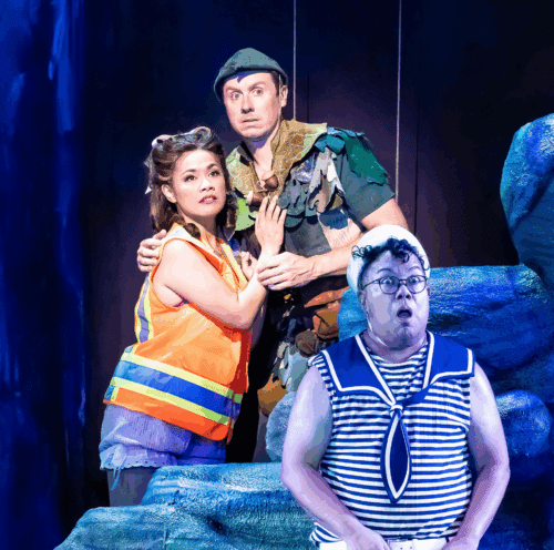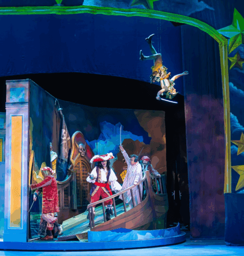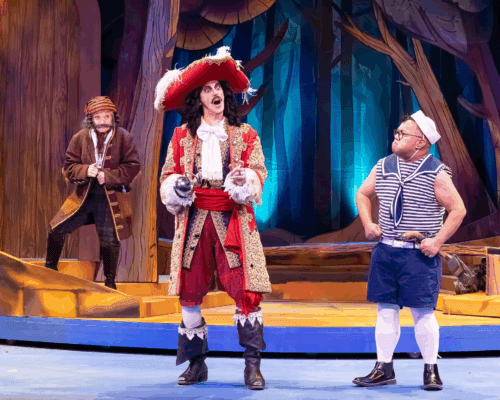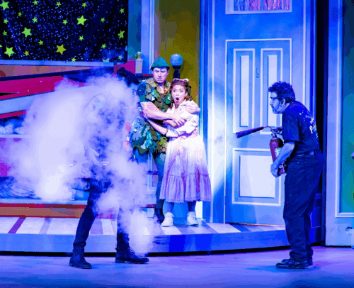 In this very British love letter to the theater, there is much to love about Peter Pan Goes Wrong. A familiar old tale of adventure, salacious off-stage romance, an underdog, a human dressed as a dog, and electrical shocks. It’s what theater does best: the thrill of everything collapsing and the joy of carrying on anyway. It’s part adventure, part backstage romp, and wholly ridiculous. Whether you’ve seen Center Theatre Group’s earlier staging or not, toss your expectations out the window (or fly through it). La Mirada’s loving fiasco invites you to laugh, cheer, and remember why we go to the theatre in the first place: because why not?