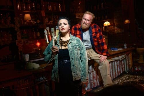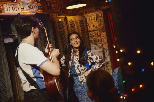 Director/choreographer Josh Rhodes makes inspired use of the intimate Theatre 154, which has been completely transformed into an immersive environment by scenic designer Daniel Allen. The space—once a traditional stage—now inhabits from wall to wall the many details and textures of the Distillery bar, not to mention a school hallway and Beau’s Memphis front porch. Rhodes stages scenes all around the room with ingenuity and flow, keeping the action dynamic and the storytelling clear. Adam Honoré’s lighting smartly delineates memory and performance, while Devario D. Simmons’s costumes help define character and time shifts without fuss. Jordana Abrenica’s sound design ensures every lyric lands, even amid full-band arrangements.