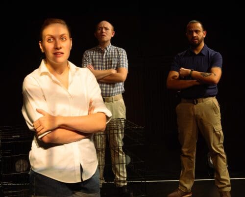 Satter’s entire script consists of the redacted transcript of the FBI’s June 2017 questioning of Winner. Parker Jennings portrays Reality Winner; Brooks Reeves and Cristhian Mancinas-Garcia play FBI agents Justin C. Garrick and R. Wallace Taylor, respectively. Together, the trio conveys the atmosphere of an FBI interrogation as it veers from chummy banter with just a hint of danger to the moment when Winner realizes she is about to be arrested. The agents repeatedly tell Winner, who they accost as she arrives home from grocery shopping, that they have a warrant. Despite this implied threat, they attempt to establish false camaraderie by discussing their shared love of dogs, workout routines and related injuries, and their mutual weapons collections. Jennings, a young woman dressed only in shorts and surrounded by armed men (Bradley Belanger lurks in the background as an unnamed agent), transitions from a confident military veteran comfortable with the jargon and routines of a security contractor to a helpless victim caught in the maw of a powerful system. By the end of the play, Winner recognizes that her own fate is sealed. Her only remaining concern is the welfare of her foster dog and her cat.