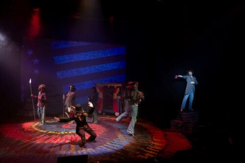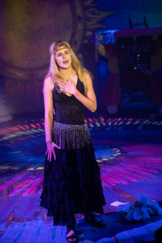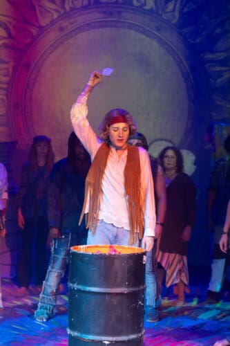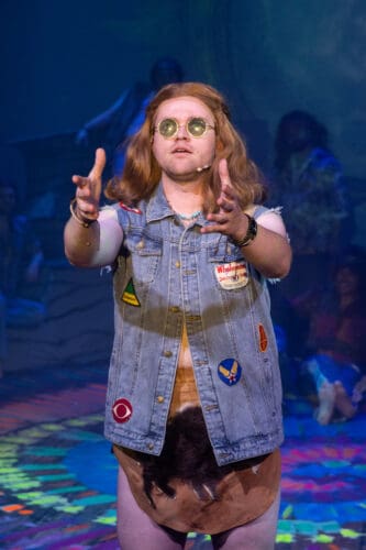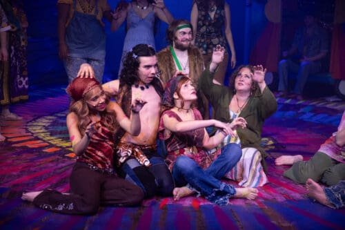 Confession: I intensely dislike Gerome Ragni and James Rado’s book and lyrics, although Galt MacDermot’s music is fabulous. It frustrates me that there is no real story presented onstage until well after intermission; most of the show consists of a musical revue, albeit an energetic and tuneful one. To the extent that Hair focuses on young people turning on, tuning in, dropping out, getting high, and rebelling against the United States, it can seem dated. Today, activists can be any age, rebellion is largely done online, and smoking marijuana has become mainstream. Those burning flags in the 1960s — assuming they had a flash into the future — would not have understood today’s protesters who carry the flag, often upside down. I also congratulate director Luke Rainey for showing respect for the flag, despite the disrespect of the era depicted. Attitudes have changed significantly since Vietnam — and especially since 9/11 — and most Americans have different views about the flag today.