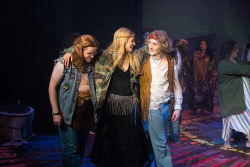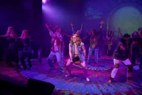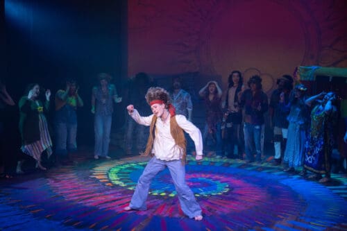 Palm Canyon Theatre’s (PCT’s) productions are always top-notch, with excellent singing, dancing, and acting. Hair, which opened last weekend, is no exception. The musical is a rollicking celebration of the hippie movement of the 1960s which took the theatre world by storm in 1968 because it had given a palatable, exuberant and tuneful voice to the contentious counter-culture revolution (just as Rent and Hamilton did). I do, however, warn people that this was — and to some extent still is — a controversial show.