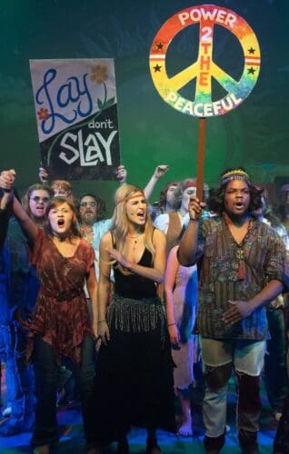 Leaving aside the weaknesses of the book and lyrics, this is a production many people will want to see — either to relive their youth, to be relieved they have left their youth, or, for those currently in their youth to witness the ridiculous things their parents and grandparents did as youngsters (however, they may relate to the angst that comes with inheriting a societal mess from know-it-all parents). As I said above, this is a fine production. The pacing, courtesy of director Rainey, is perfect. The live musical combo — under the direction of Steven Smith — is a pleasure to hear.