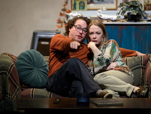 Visually, Jason Reale’s set grounds the production in a lived-in New York apartment that feels both intimate and slightly heightened—a space where domestic comfort and emotional volatility coexist. The environment supports the play’s central tension: a seemingly stable world constantly on the verge of rupture.