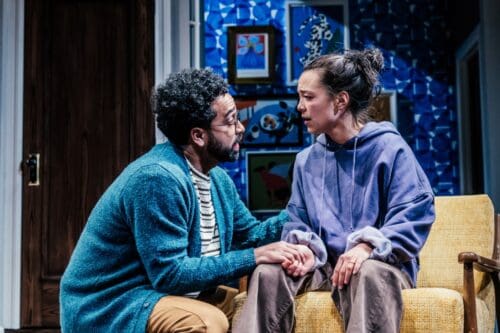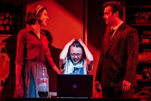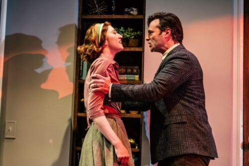 The play layers 1958 Beacon Hill over contemporary creative despair. Sylvia (Marianna Gailus) and Ted Hughes (Cillian O’Sullivan) drift through the same apartment now occupied by Sally (Midori Francis) and her husband Theo (Noah Keyishian). Sally has promised to write a book about Plath and Hughes. Instead she stress eats, doom spirals, and regards her laptop as though it might explode. Living in Plath’s former home produces not inspiration but a low hum of terror. Hyland keeps Sylvia and Ted suspended between ghost, hallucination, and embodiment of Sally’s unfinished manuscript. The ambiguity could be thrilling. Instead, it plays like indecision dressed up as mystery.