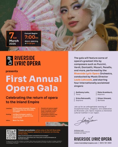 Riverside has one of the largest collections of Mission-style architecture in Southern California, a university campus that keeps expanding, and a population now north of 300,000. What it has not had, for longer than anyone seems comfortable admitting, is opera. That changes on March 7, when Riverside Lyric Opera presents its Grand Re-Opening Gala Concert at UC Riverside’s University Theatre. And the company is not easing back in with a modest recital and a rented Steinway. They’re fielding a 54-piece orchestra, four soloists with international credentials, and a program built from the repertoire’s greatest arias and ensembles. Go big or stay home, apparently.