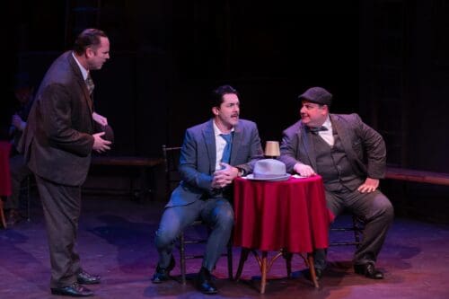 To finance his search for a temporary site, Nathan bets visiting high roller Sky Masterson (Carter Michael) that he cannot persuade Sarah (Allsun O’Malley), the leader of the local Salvation Army-style mission, to go to pre-Castro Havana with him for an evening. But this itinerant gambler’s slot machine comes up all hearts, and he has to put more than his bank roll on the line. As Sky worms his way into Sarah’s world, Nathan ducks the cops and his girl — with the help of his two tinhorns, Nicely-Nicely Johnson (Anthony Arpino) and Benny Southstreet (Kyle Vaughn) — as all of New York’s underpinnings sing and dance up a storm.