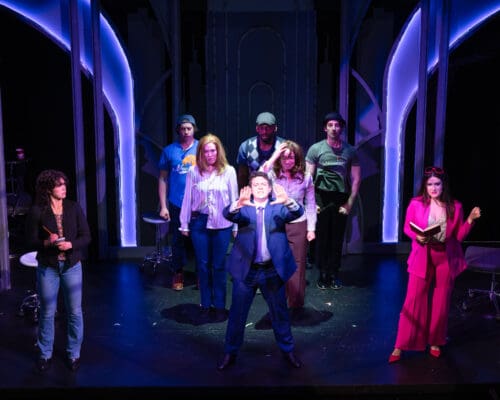 In the intimate AMT Theater, a charming and cozy space, Ryan Howell’s attractive scenic design makes the most of the smaller stage for the 12-member ensemble. The classic Art Deco aesthetic is further enhanced by John Burkland’s lighting. Steven Fine’s sound design ensures every lyric is clearly heard, though it’s not entirely convincing that the dialogue needed quite so much amplification. David Wolfson’s music direction draws out strong choral work from the ensemble, whose voices are uniformly impressive. On keyboards, he conducts bassist Ken Rizzo and percussionist Greg Landes, creating a full sound one might never guess comes from only three musicians.