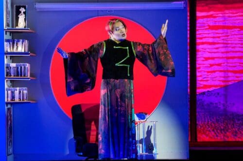 Part of what makes this new production so refreshing is that it engages the opera’s problematic Orientalism directly and unflinchingly. Ozawa embraces Puccini’s Orientalism by converting it into the fantasy that it is through virtual reality (VR) and video games. (It might be more accurately described as isekai, a Japanese fantasy genre in which the main character is transported into an alternative world with or without the possibility of returning to the present.) Thus, before the music begins, the curtain opens on a contemporary American apartment setting. Pinkerton grabs a beer, dons a VR headset, and enters a fantasy version of turn-of-the-twentieth-century Japan. This framing device returns not only at the end of the final act, but at the transitions between each act.