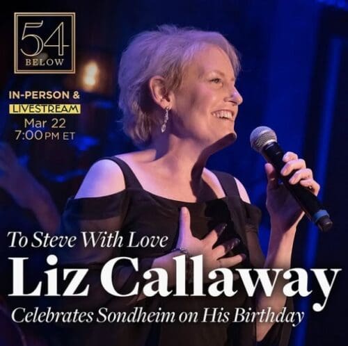The return of the Schwartz set is timed to the week of the release of the Schwartz-centric excellent recording titled The Wizard and I: Liz Callaway Sings Stephen Schwartz (officially released on Friday, March 20, but advance copies were available for reviewers). The March 18 opening night of the live performance run reprised quite loyally what’s captivatingly captured on disc (or digital or streaming). The valentine to Mr. Schwartz continues on Release Day and concludes on Saturday night. Sunday, March 22 is the 96th anniversary of the birth of the late Stephen Sondheim, an appropriate date to honor him with a one-night-only return of To Steve With Love – Liz Callaway Celebrates Sondheim, another valued valentine that’s been a joy as an album and live show to experience. All performances are at 7 PM, and the March 20 and 22 concerts can be viewed via the livestreaming option in real time (but you can play the recordings any time you want — and you’ll want to do that often if you like involved interpretations of great material and interesting interwoven anecdotes).
