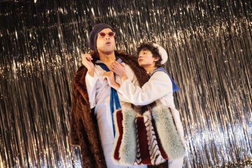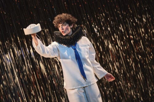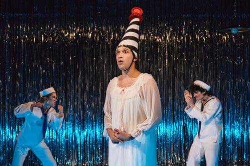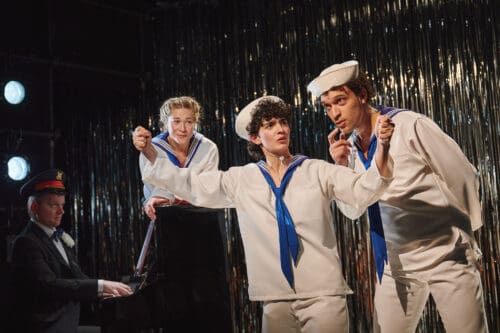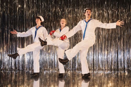 Krit Robinson’s scenic design features a silver Mylar rain curtain stretching across the upstage wall, catching and refracting Masha Tsimring’s lighting to pleasing effect. Enver Chakartash’s costumes begin with the familiar white-capped, blue-kerchiefed sailor suits, supplemented by a well-stocked rack of additional pieces that facilitate the performers’ rapid-fire character transformations.