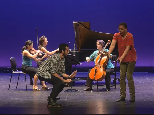 Cate Smit will narrate the stories, inserting the crowd’s contributions for the plot as it thickens and quickens apace. That’s just one segment of a full program where actors are ready for anything, along with some glorious classical music played by violinist Ariel Horowitz (Concert Artists Guild Competition winner whose work has been heard at Carnegie Hall and the Kennedy Center), Mitch Lyon (cellist and Teaching Artist Faculty member with the New York Philharmonic), and Carter Johnson (international prizewinning pianist and finalist in the 2025 Van Cliburn International Competition). Audiences can follow a young protagonist as she finds herself in situations such as discovering a mysterious object (the audience will decide what it is), dining in a fancy restaurant (the audience will decide what she eats), and landing even more mysteriously in a metaphysical plane TBA.