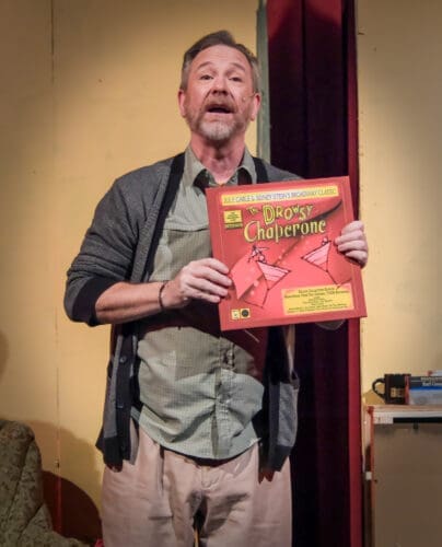 The Drowsy Chaperone is a show within a show. The show begins with a single middle-aged musical theater fanatic sitting alone in a chair in his apartment (the character is identified in the playbill only as “Man in Chair”). Talking directly to the audience, and feeling “blue,” Man decides to play a favorite old album from his vast collection—a fictional 1928 musical called The Drowsy Chaperone.
