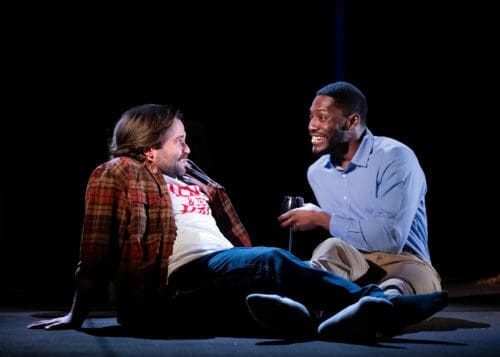 Jake Borelli, fresh off eight seasons on Grey’s Anatomy, brings to Stevie the precise comic intelligence the role needs. Stevie’s dietary ethics are organized around the concept of soul presence, which he applies selectively to fish, and Borelli delivers this theology with the deadpan seriousness of a man who has spent years refining an argument he knows other people will mock. The sole joke lands exactly because Borelli never leans on it. The scene in which Chris and Stevie navigate this theology over menus, with Cindy watching from her chair and Watson hovering at the edge of the table, is the production’s first fully realized sequence: funny on the surface, quietly devastating underneath, and alive to the play’s real concerns without ever announcing them.