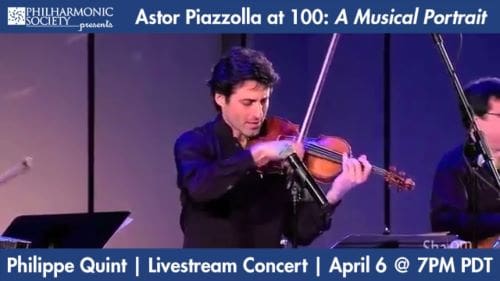 Philippe Quint returns to the stage in April to present two of his signature curated multimedia shows in California, streamed online. On Tuesday April 6, 2021 at 7pm PT, the Philharmonic Society of Orange County presents the world premiere of violinist ’s newest multimedia show, Astor Piazzolla at 100: A Musical Portrait with pianist Jun Cho. Quint’s narration leads…