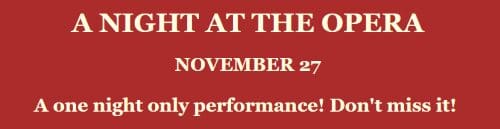 Join CineCity Studios in Chicago for a night of elegance, flair, wine, champagne and an operatic concert on Saturday, November 27th. 7:30pm Doors Open & Cocktail Reception; 8:30pm Concert; 10pm Post-Show Reception A Night at the Opera features event founders & acclaimed opera singers Benjamin De Los Monteros and Marisa Buchheit. Musical guest on electric violin and Concertmaster…