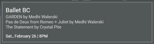 This Saturday, February 26 at 8, The Soraya’s resident ballet company, Ballet BC, offers a program of unusual depth with two works: GARDEN (by the new Artistic Director Medhi Walerski) and The Statement from Crystal Pite, both originally created for Nederlands Dans Theatre (NDT). The program also includes a Pas de Deux from Walerski’s Romeo…