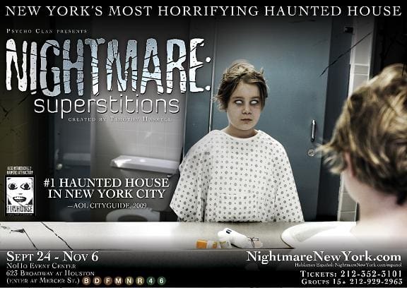 BE UNAFRAID … BE VERY UNAFRAID No, the spooky kid from Nightmare: Superstitions‘ print ad campaign isn’t part of the installation, but almost every out-of-respectable-work actor is. The latest creation from the demented mind of Timothy Haskell, the 7th in a series of haunted houses, may be AOL Cityguide’s No. 1 rated haunted attraction in…